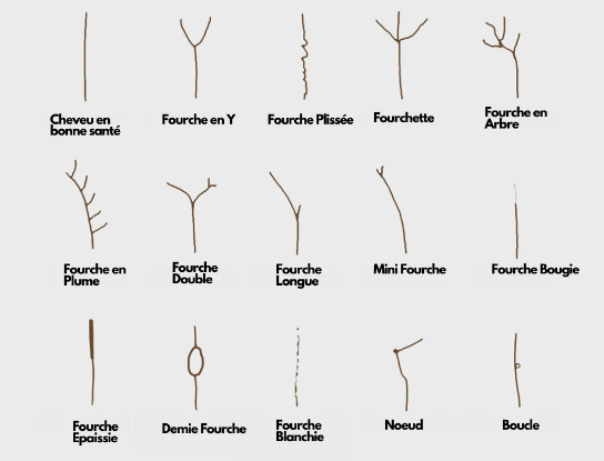 Au fur et à mesure des mois, la fibre capillaire va se fragiliser au niveau des extrémités. Le bout des cheveux va s'assécher et avoir des fourches. Cela signifie que les pointes vont se dédoubler ou avoir des nœuds. Ce tableau vous aidera à reconnaître les différents types de fourches.