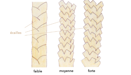 • Faible : les écailles de la fibre capillaire sont très peu ouvertes